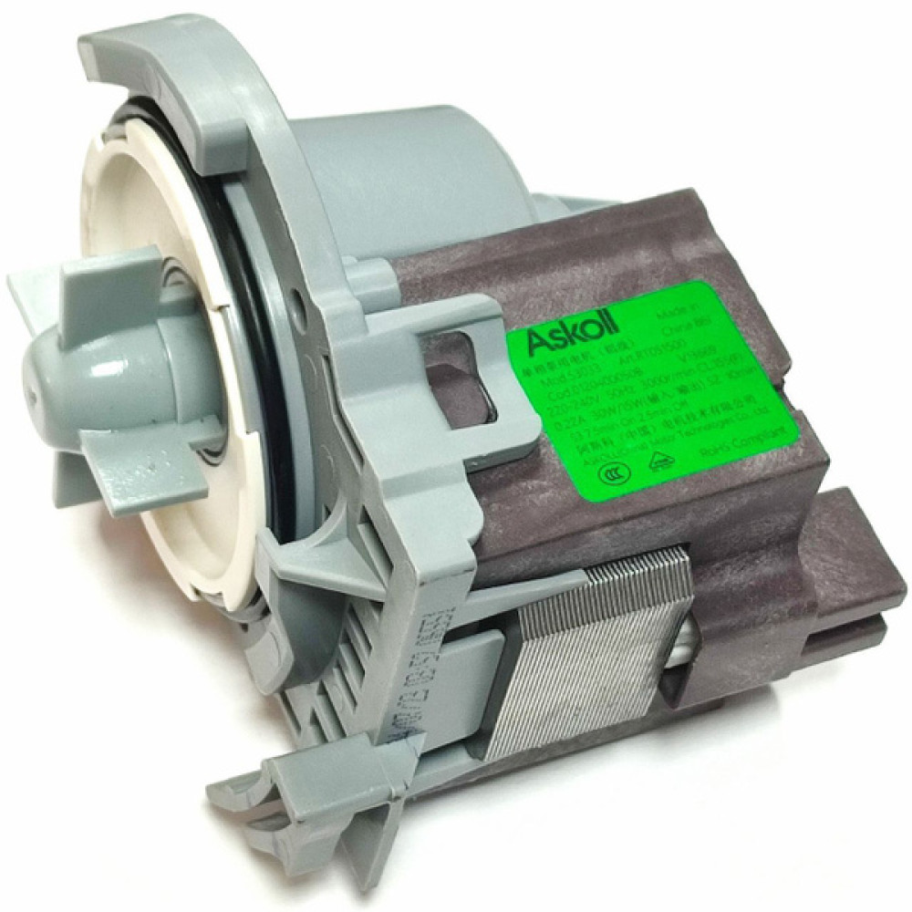 Помпа сливная Askoll 30W / 15W mod. S3033 Art.RT051500 V13669 220-240V 3000r/min 7.5 min ON – 2.5 min OFF крепление под 3 защелки, верх скошен, клеммы сзади под фишку вместе для посудомоечных машин Haier (Хайер)